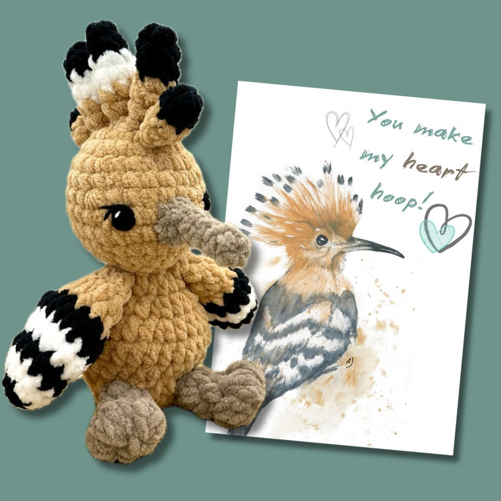 Hannah Hoopoe snuggler with greeting card.